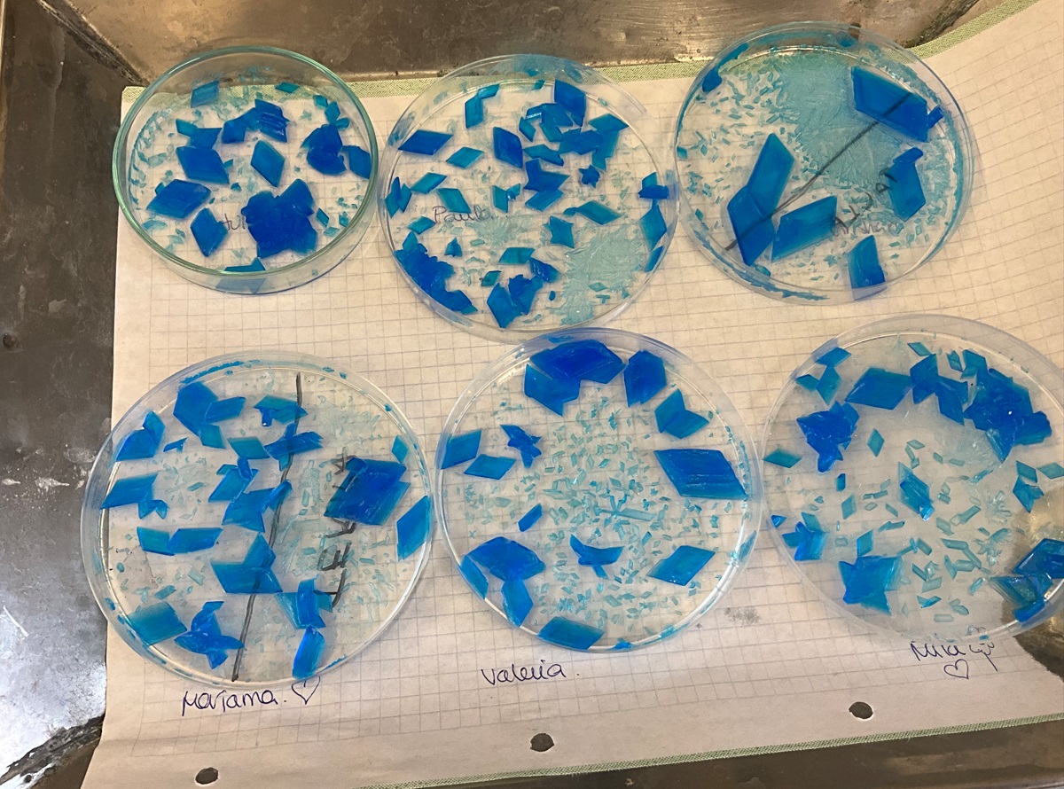 Els alumnes de 2n d’ESO han realitzat la cristal.lització del sulfat de coure (II) per així obtenir cristalls d’un blau intens i forma romboide.