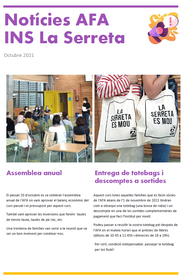 L’AFA és l’Associació de Famílies de l’Alumnat. Som una part integrant de la comunitat educativa: la implicació directa de les famílies a l’institut garanteix una millora en la qualitat de l’educació i el benestar dels nostres fills i filles.