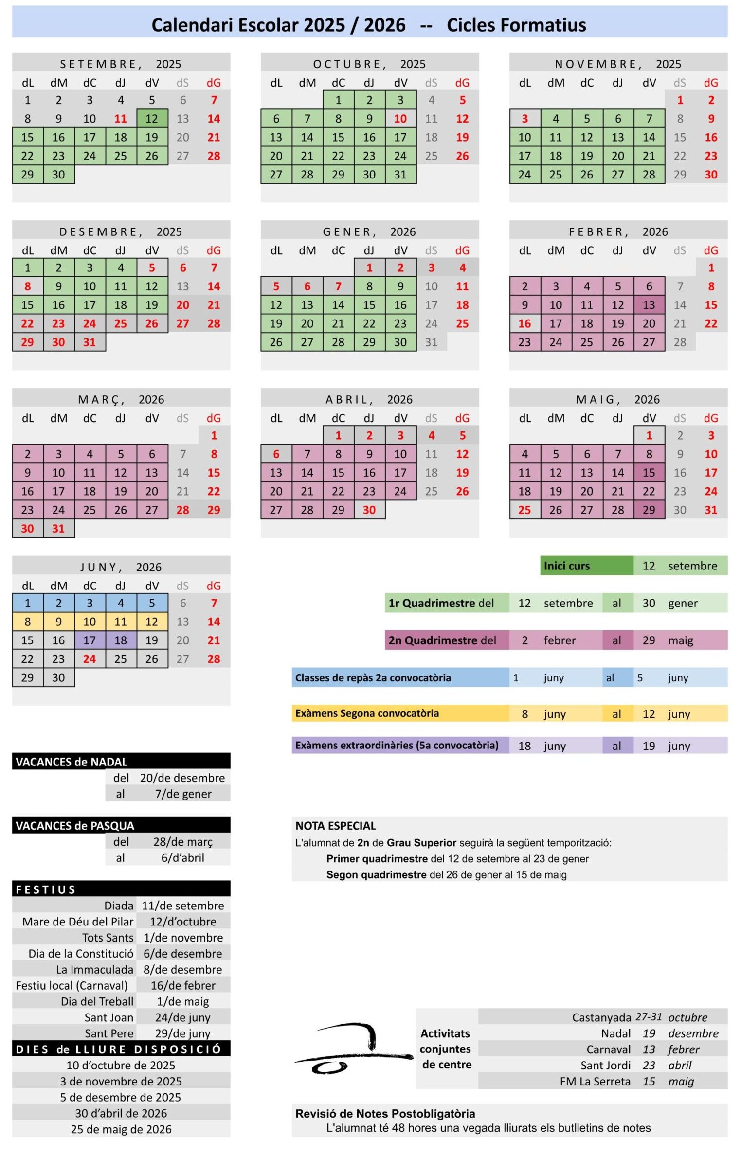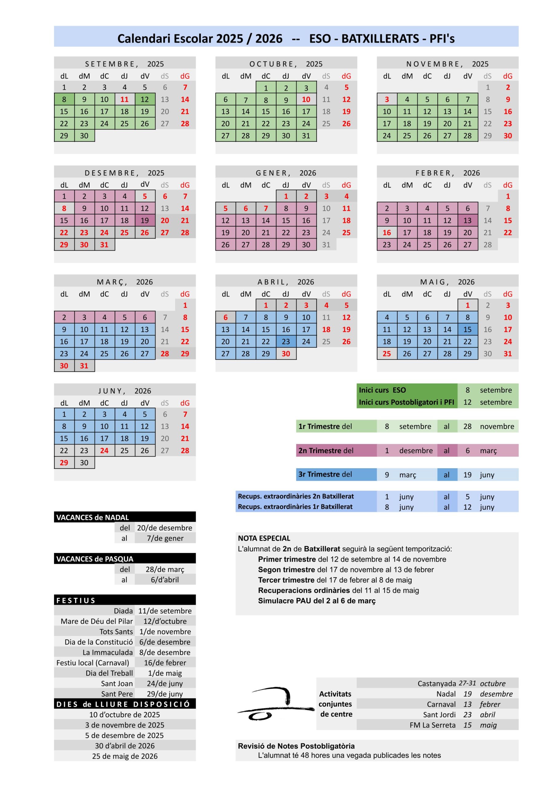 Calendari curs 2025-26 Descàrrega del calendari: Calendari ESO – BATXILLERAT – PFI Calendari Cicles formatius.
