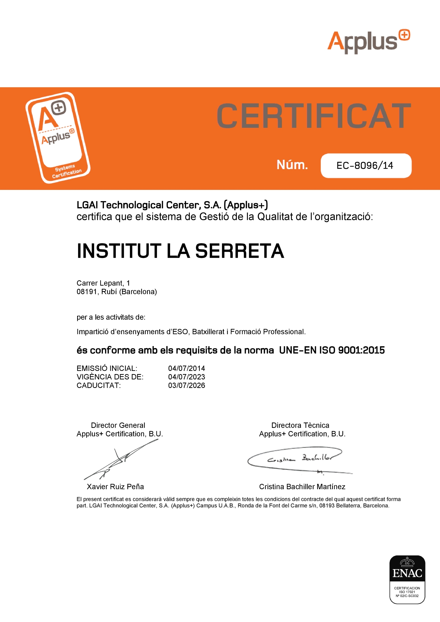 Per a l’Institut La Serreta la Qualitat és la part fonamental i prioritària de la seva filosofia i estratègia. L’actuació de l’institut, d’acord amb el projecte educatiu del centre, està dirigida a: