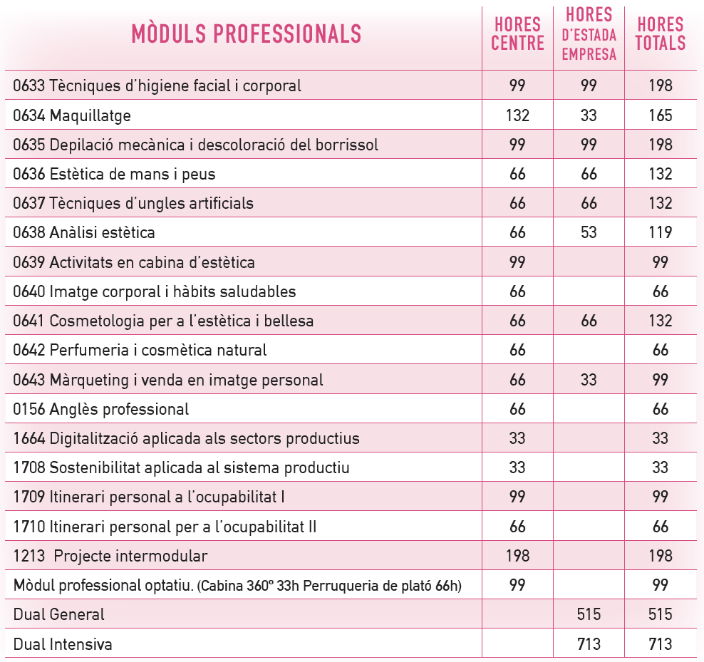 Aquests estudis capaciten per dur a terme tècniques d’embelliment personal i comercialitzar serveis d´estètica, cosmètics i perfums, complint els procediments de qualitat i els requeriments de prevenció de riscos laborals i protecció ambiental establerts en la normativa vigent. La durada és de 2000h, distribuïdes en dos cursos acadèmics, en modalitat presencial de tarda.