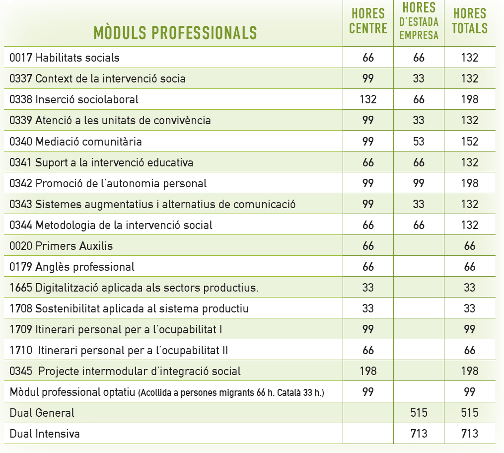 Aquests estudis capaciten per programar, organitzar, implementar i avaluar les intervencions d’integració social. La durada és de 2.000 hores distribuïdes en dos cursos acadèmics, en modalitat presencial de tarda.