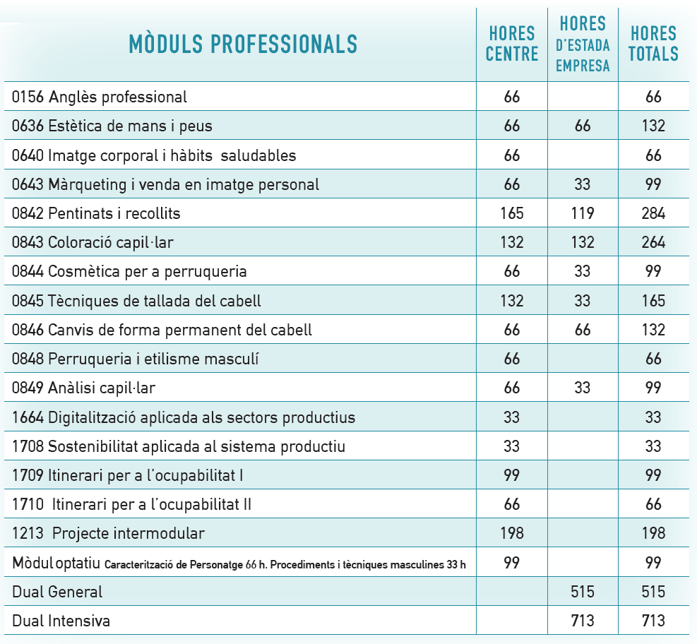 Aquests estudis capaciten per fer la cura i l’embelliment del cabell, l’estètica de mans i peus i l’estilisme masculí, així com comercialitzar serveis i venda de cosmètics, complint els protocols de qualitat, prevenció de riscos laborals i protecció ambiental. La durada de 2.000 hores distribuïdes en dos cursos acadèmics, en modalitat presencial de matí.