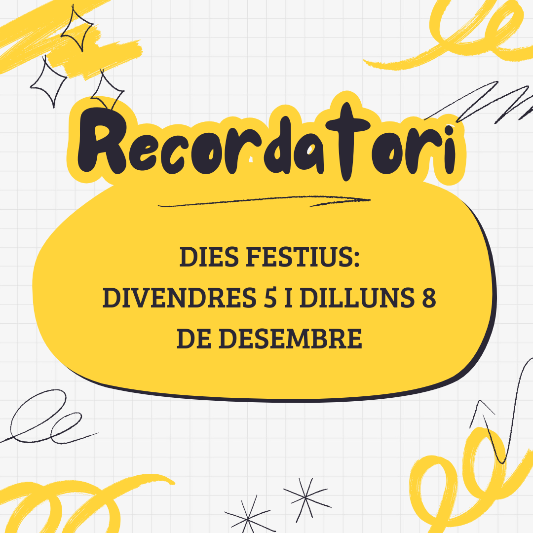 Us recordem que divendres 5 i dilluns 8 són dies festius i per tant el centre romandrà tancat.