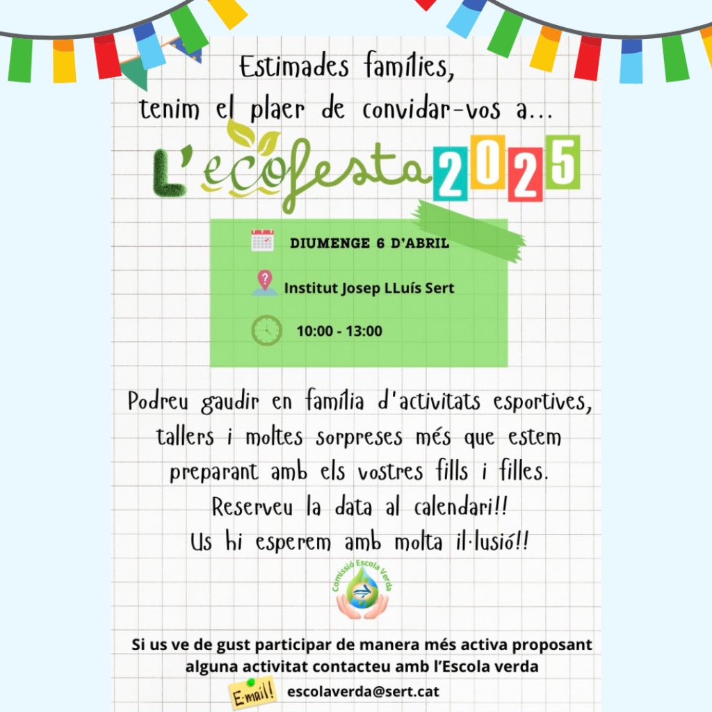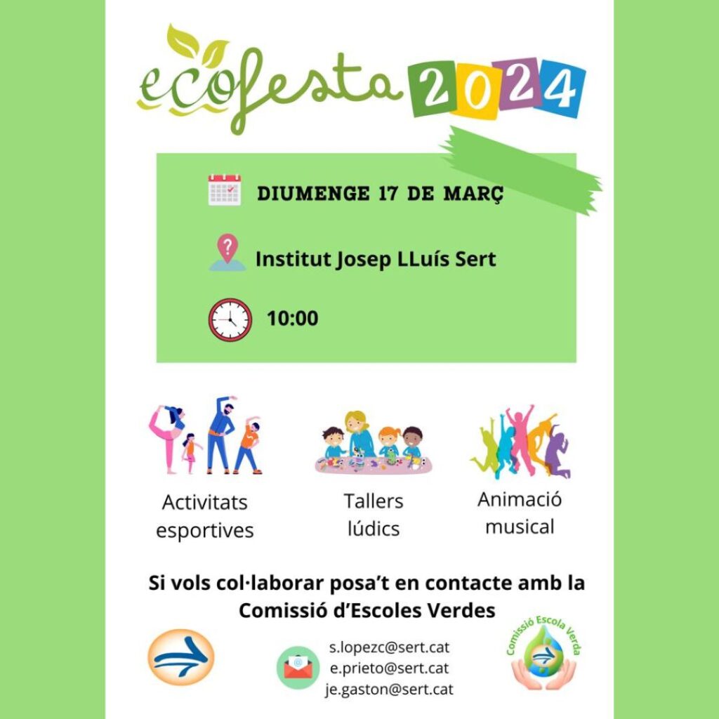 Un any més us convidem a l’Ecofesta del Sert, un espai de trobada en el que ens reunim per gaudir de diferents activitats esportives i tallers lúdics preparats amb l’ajuda de l’alumnat i les famílies. Us hi esperem a tots i totes!!!