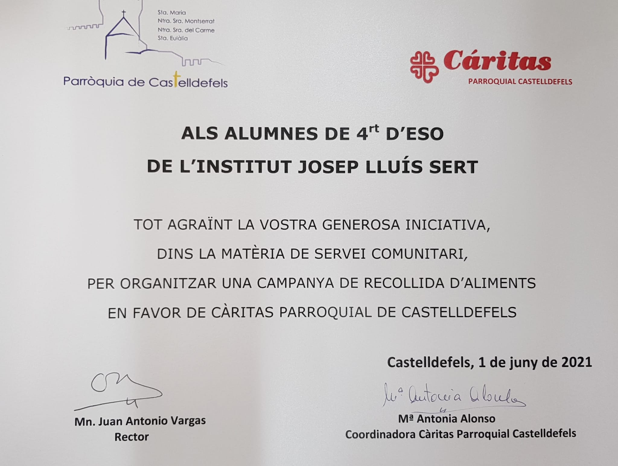 Un grup d’alumnes de 4t d’ESO han col.laborat amb Càritas organitzant una recollida d’aliments com a part de la matèria de Servei Comunitari. Finalment s’han recaptat més de 350 productes, entre els quals hi havia 148 kg de pasta i arròs, 72 kg de llegums i 22 paquets de galetes. També es van recollir grans quantitats de llet, alimentació infantil i llaunes de conserves. Tot un éxit! Moltes gràcies a tots i totes les que ho heu fet possible amb la vostra aportació!