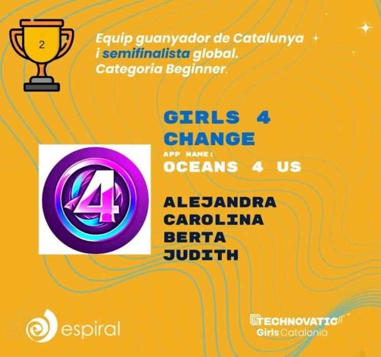 L’equip “Girls 4 Change”, format per la Judith Agustí, l’Alejandra Bermúdez, la Carolina Comba i la Berta Manetas, de 3r d’ESO, ha estat escollit com a equip guanyador de Catalunya al Technovation Girls en la categoria Beginner per la creació “Oceans 4 Us”.