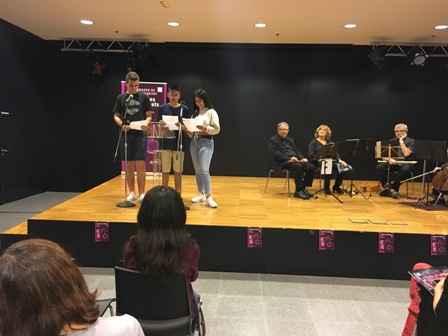 Dayla Salazar, ZilianLiu i Marc Redondo, tots tres alumnes de 4rt ESO, van participar en el recital poético-musical que el grup literari ALGA i el quartet ASSAI van oferir el passat 19 d’octubre. L’acte formà part de les “30es Jornades de Pau i Solidaritat” que enguany han portat com a lema “Reduïm les desigualtats”.