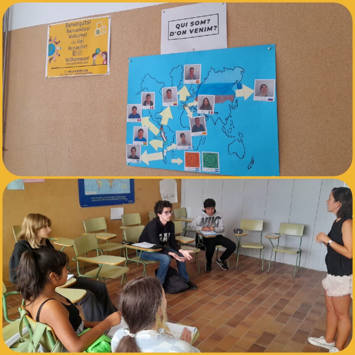 Un dels primers treballs que vam fer a l’aula d’acollida va ser dibuixar un mapa del món per saber d’on ve cadascú. Ens vam dividir en dos grups, vam fer el dibuix i vam pintar els diferents països d’origen dels companys de classe: Argentina, Perú, Colòmbia, Bolívia, Rússia, Ucraïna, Itàlia i Espanya. També vam enganxar la nostra foto a cada país i ho vam penjar a l’aula.