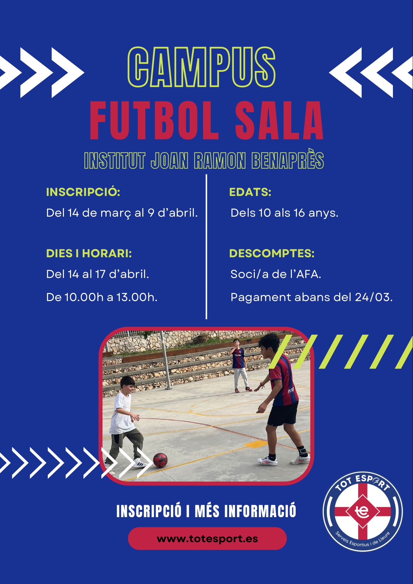 Us volem informar que des de l’AFA del centre arriba l’organització del 1r Campus de Futbol Sala de Setmana Santa – TOT ESPORT.