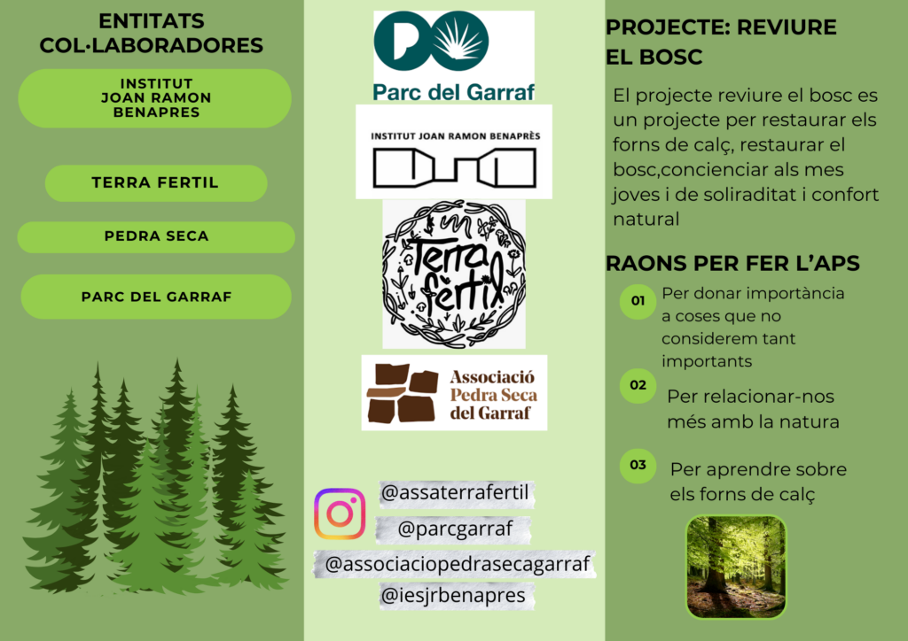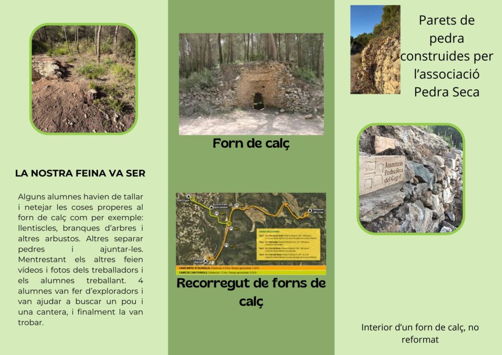 El dia 19 de novembre els alumnes del Benaprès van anar a ajudar a restaurar un forn de calç al Parc del Garraf amb Ferran Surriba, de Terra Fèrtil, i Sergi Torres, de Pedra Seca. A la sortida, van estar dividits en quatre grups: Gestió forestal, Comunicació, Restauració i recerca i El pou i la pedrera. Cada grup s’encarregava les següents tasques: