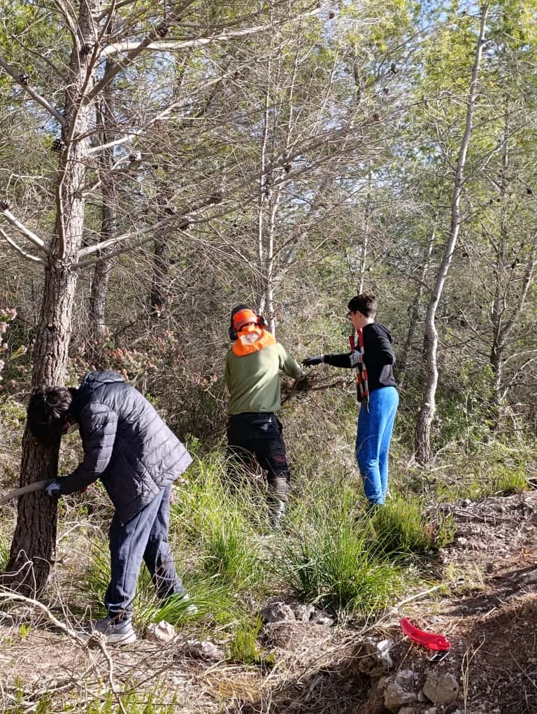 El grup de gestió forestal es va encarregar de tallar branques i arbres petits i mitjans per donar espai als treballadors per restaurar el forn de calç. A més, els treballadors van ensenyar als alumnes com fer una falca i així poder tallar un arbre correctament. També, al final de la sortida els treballadors de la Brigada de Manteniment del Parc del Garraf van fer una demostració a tots els alumnes del projecte, de com es tallen els arbres grans amb moto-serra.