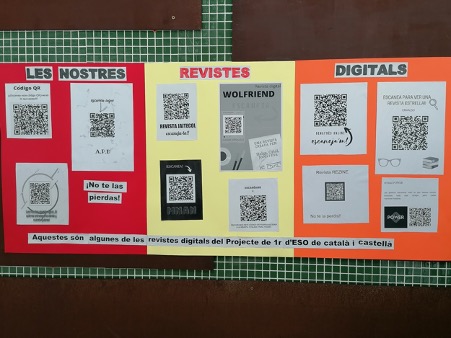Durant el primer quadrimestre, en un dels projectes de l’àmbit lingüístic (llengua catalana i llengua castellana), l’alumnat de 1r d’ESO B, C i D ha preparat, amb molt d’esforç i entusiasme, la seva Revista Digital. Ha sigut un procés laboriós, en el qual l’alumnat ha començat a crear textos en paper, els ha avaluat, els ha repensat i millorat, i els ha acabat passant a format digital per tal de donar forma a la seva revista. En el procés, ha treballat diferents tipologies textuals, i s’ha hagut de posar a la pell d’escriptors/es, periodistes, editors/es i dissenyadors/es. Un cop acabada la seva revista, ha convertit l’adreça web en un codi QR per tal que tothom qui vulgui pugui veure aquestes publicacions fent un sol clic amb el telèfon mòbil. Al vestíbul de l’institut hi ha una mostra d’alguns Qr de les revistes elaborades.