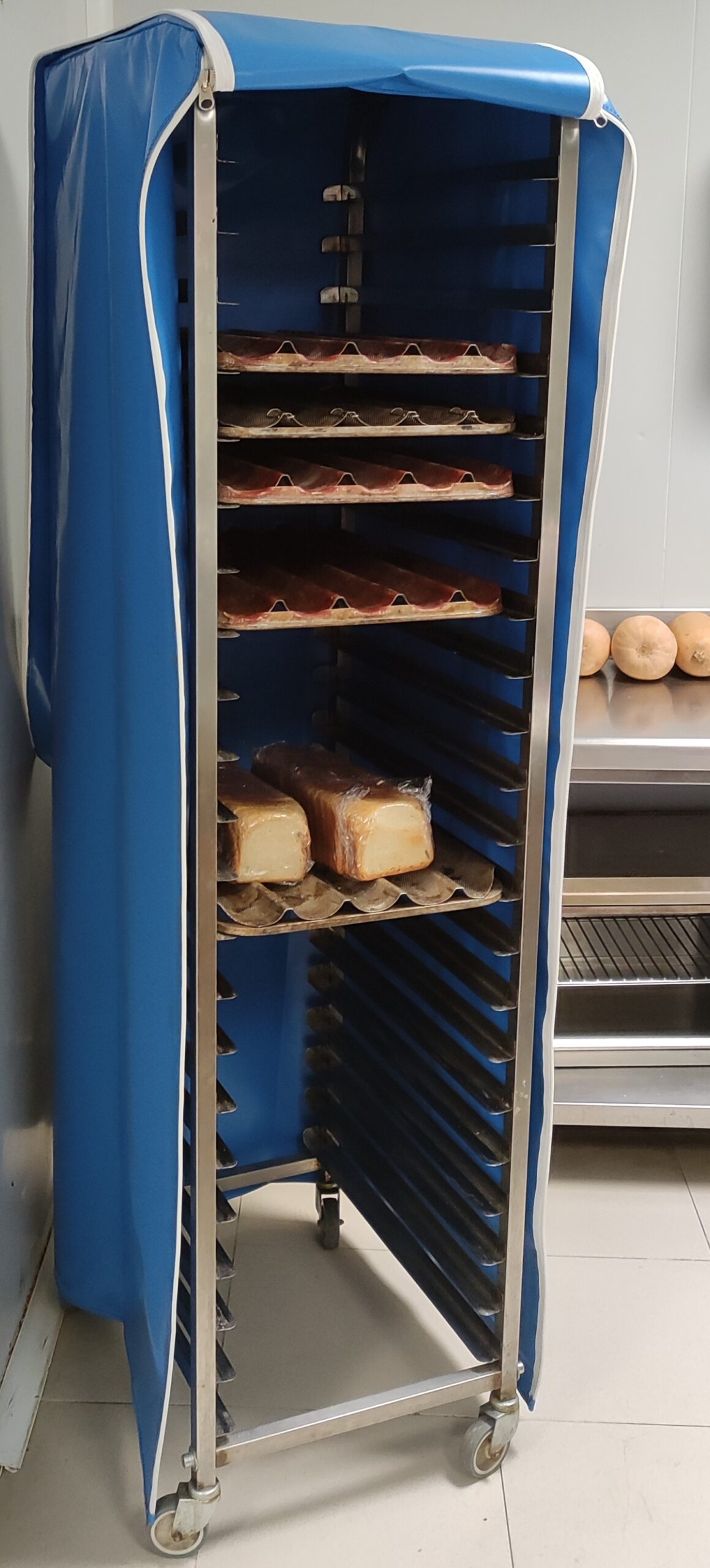Es veu que abans per guardar el pa s’utilitzava aquesta estructura porta safates i s’embolicava amb plàstic per mantenir-ho dins de les cambres frigorífiques i congeladors per conservar-lo, fent que no agafessin males olors i per evitar que es cremés el pa amb el fred.