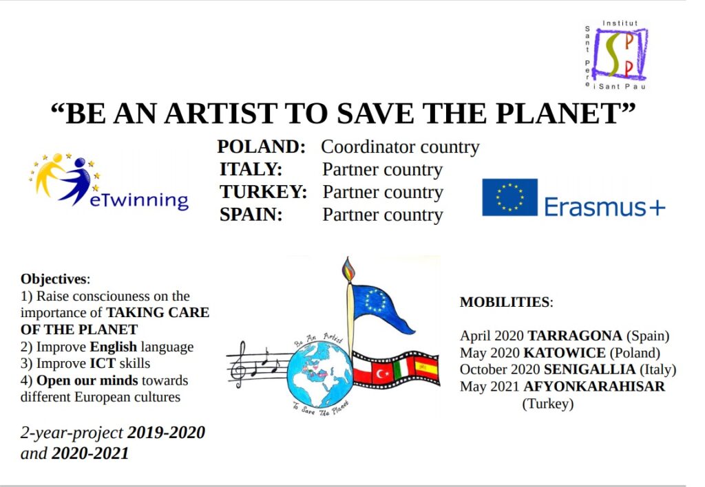 La mobilitat de Polònia (Katowice) tindrà lloc al maig 2020, la d’Itàlia (Senigallia) a l’octubre 2020 i la de Turquia (Afyonkarahisar) al maig 2021. Durant aquestes mobilitats es realitzaran diferents manifestacions artístiques relaciones amb la protecció del medi ambient. Al nostre centre farem un concert 🎵 anomenat «Concert to Save the Planet», a Polònia, una representació teatral 🎭, a Itàlia produccions àudio-visuals 📽️ i a Turquia una exhibició fotogràfica 📷.