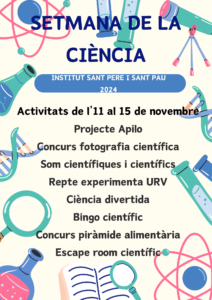 De l’11 al 15 de novembre, l’institut va celebrar la Setmana de la Ciència amb un ampli ventall d’activitats pensades per fomentar la curiositat, l’esperit crític i l’interés per la ciència entre l’alumnat. Al llarg de la setmana, l’alumnat va participar en propostes lúdiques, educatives i creatives relacionades amb diferents àmbits científics.