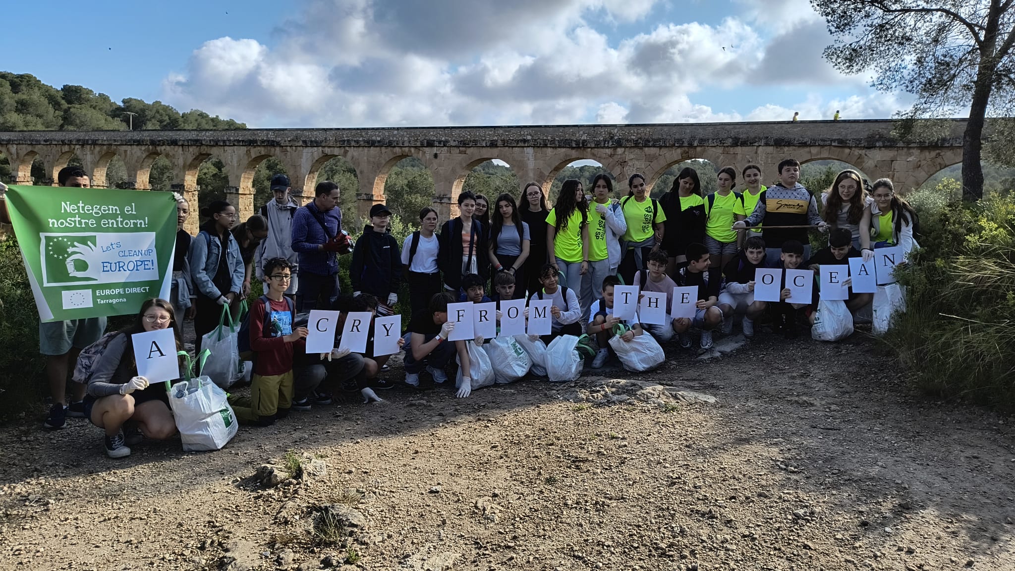 On Tuesday 13th in the morning, our 10 students and the French group went to visit the Devil’s Bridge. We invited Sergi Quiñonero, an artist that makes works of art out of waste. We collected rubbish on our way to the Devil’s Bridge. Once there, Mr. Quiñonero gave instructions on his idea of a work of art representing worry about the pollution of the seas and all the students collaborated to do this work of art, which is entitled The Landscape is changing, the landscape is crying.