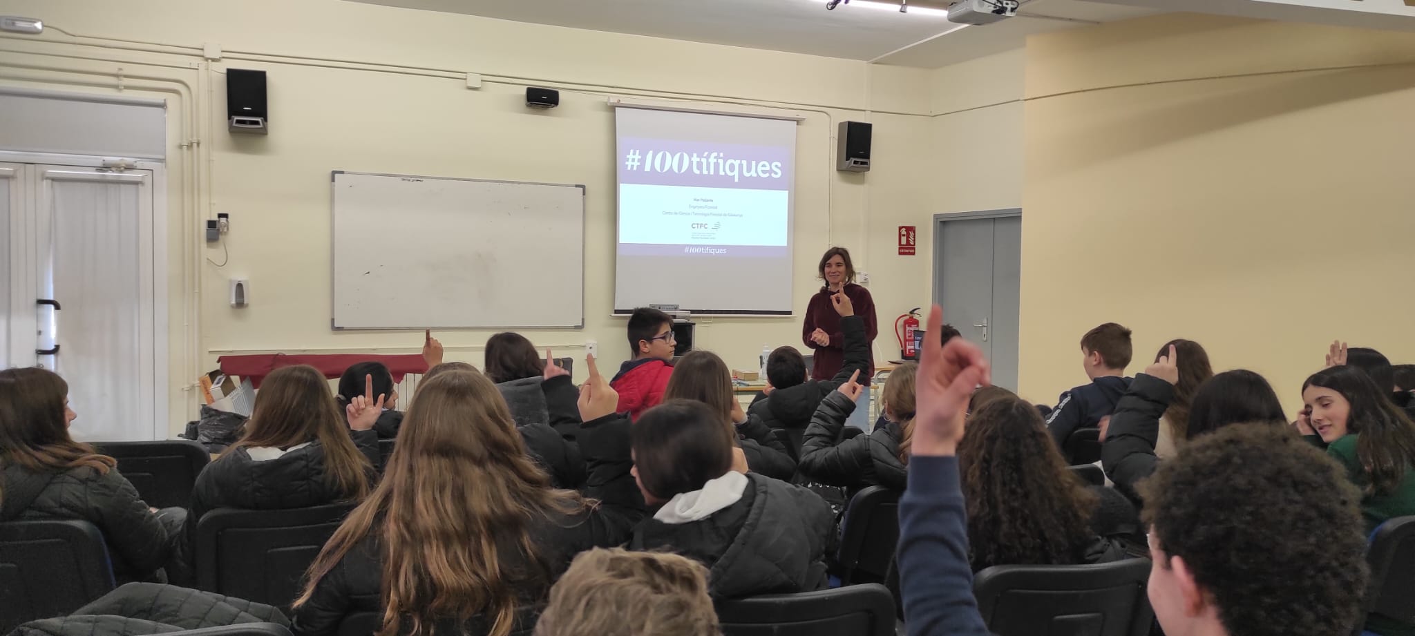 Aquest dilluns 13 de febrer per celebrar el Dia Internacional de la Dona i la Xiqueta Científiques els alumnes de 1r d’ESO vam gaudir de la visita a l’institut d’una científica que ens va fer una xerrada molt interessant dins del programa #100tífiques. Mar Pallarès és enginyera forestal i treballa al Centre de Ciència i Tecnologia Forestal de Catalunya (Solsona). Treballa a l’Àrea de Gestió Forestal Sostenible i està especialitzada en planificació i gestió forestal per la conservació de la biodiversitat, per l’adaptació dels boscos al canvi climàtic i en temes de boscos madurs. Es dedica sobretot a la transferència, o sigui, a aplicar i transmetre el coneixement científic. El seu lloc de treball és al bosc i a l’oficina, i també viatja bastant per anar a congressos i seminaris. Vam tindre la sort de conèixer de prop la seva feina i ens va transmetre el seu entusiasme per la ciència. També vam veure l’exposició (In)visibles i (O)cultes.