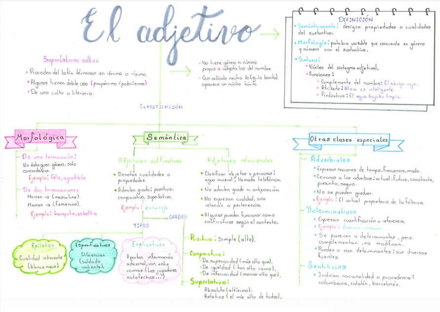 Nuestros alumnos de 2º de bachillerato, en la materia de lengua castellana y literatura, han presentado unos mapas y esquemas visuales increíbles para explicar la teoría del adjetivo.