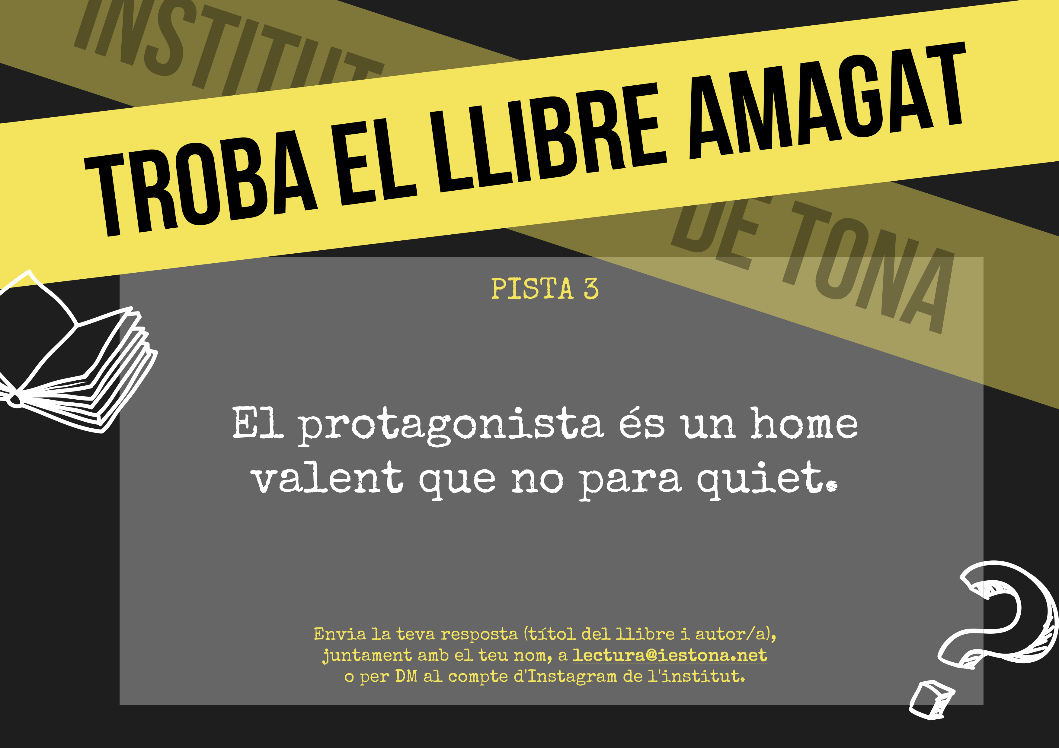 Envieu les vostres respostes (títol del llibre i autor/a), juntament amb el vostre nom i cognom, per DM o a les stories d’Instagram de l’Institut de Tona (@instituttona). Si ho preferiu, podeu enviar un correu a lectura@iestona.net