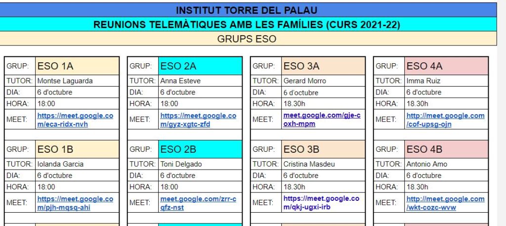 Llistat de reunions telemàtiques entre el tutors dels grups del nostre centre i les famílies dels alumnes.