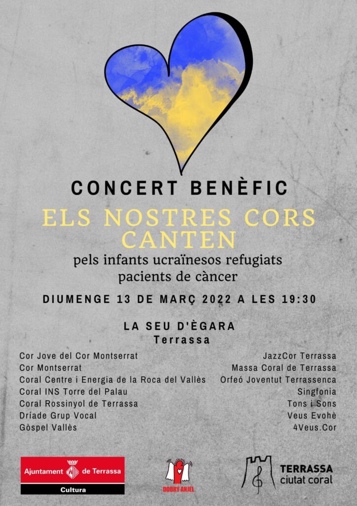 Aquest diumenge 13 de març les Corals de Terrassa cantarem per Ucraïna, la Coral de l’INS TORRE DEL PALAU també hi participarem. La música és un llenguatge internacional que tothom entén. Vine i acompanya’ ns, dona suport al poble ucraïnès.