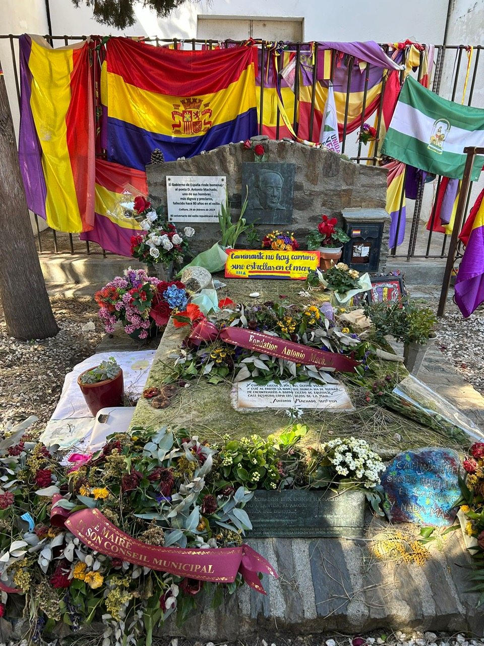 A continuació, ens vam desplaçar a Collioure, poble de pescadors on van trobar refugi el poeta Antonio Machado, el seu germà i la dona i la mare de tots dos, on va morir i està enterrat. Li vam retre homenatje a la seva tomba, que s’ha convertit en un símbol de resistència a l’oblit.