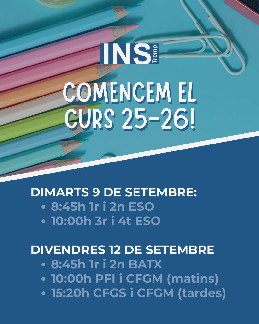 CALENDARI ENSENYAMENTS PREINSCRIPCIÓ MATRÍCULA ESO 6 – 18 març 22 – 30 juny BATXILLERATS 9 – 16 abril 18 – 30 juny CICLE FORMATIU GRAU MITJÀ 26 maig – 1 juny 10 – 14 juliol CICLE FORMATIU GRAU SUPERIOR 26 maig – 1 juny 10 – 14 juliol PFI 4 – 13 maig 6 – […]