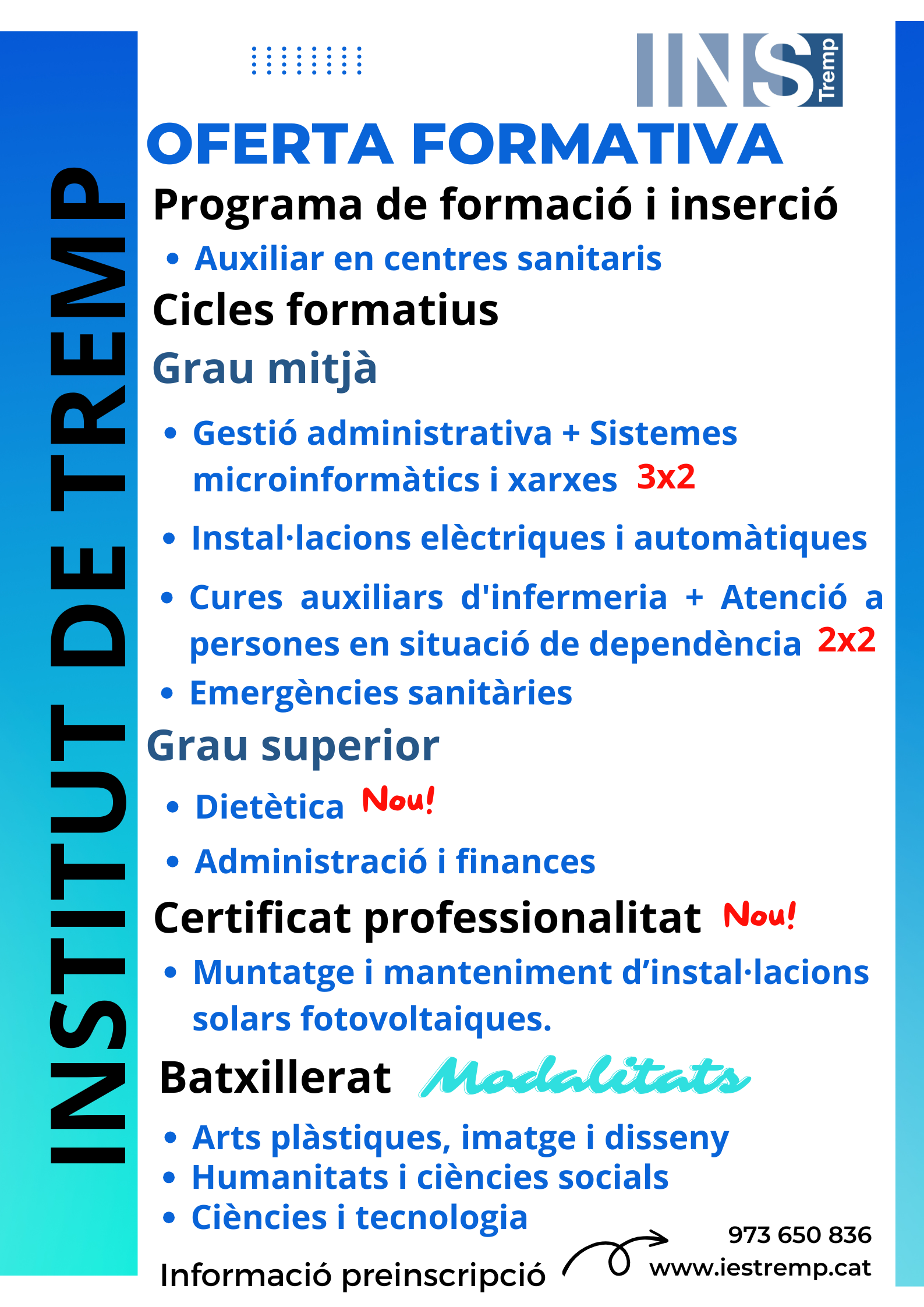 Obrim les portes perquè pugueu conèixer de primera mà l’oferta dels nostres ensenyaments postobligatoris. El dijous 3 d’abril a les 17:00h celebrarem una sessió de portes obertes dedicada a aquests estudis. L’activitat inclourà una xerrada informativa general i, a més, tindreu l’oportunitat de fer consultes específiques i rebre orientació personalitzada sobre cada ensenyament, de la mà del professorat especialista.