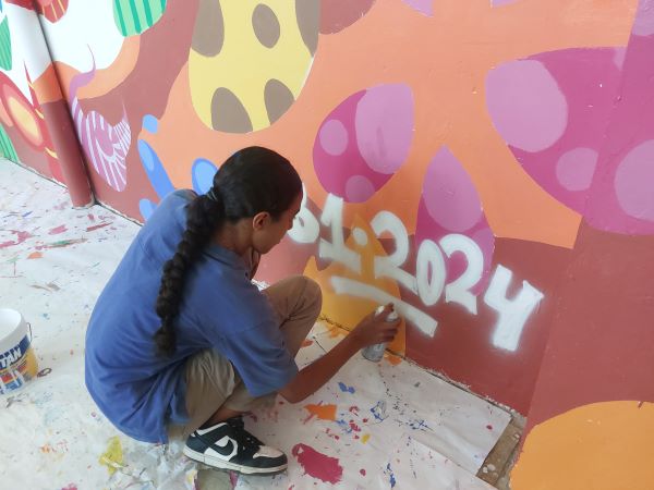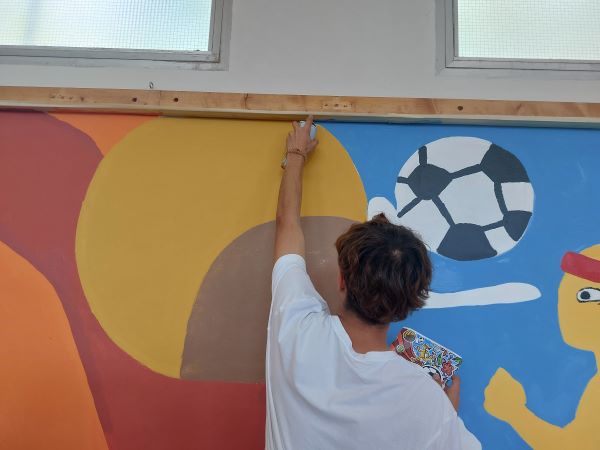 Han sigut dues setmanes intenses de treball per poder fer un mural de 10 metres amb tècnica mixta (pintura plàstica i spray) on es pot veure la representació de la diversitat de totes les emocions que senten les persones quan fan esport. Gràcies per la feinada!