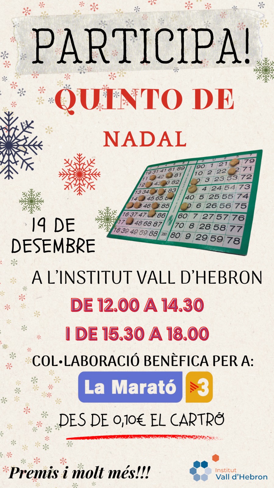 El proper dimarts 19 de desembre es farà a l’institut el primer Quinto de Nadal, on tots els diners recaptats aniran destinats a la Marató de TV3 d’enguany.