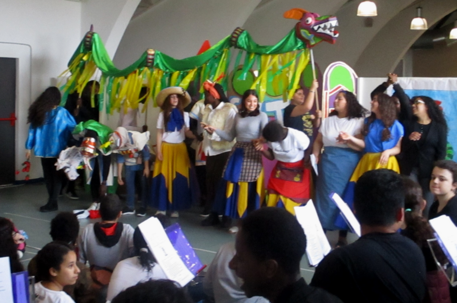 El dia de SANT JORDI l’alumnat de les Optatives de 4t d’ESO, d’Arts Escèniques, Música i Plàstica, varem representar l’obra de teatre: EL DRAC QUE TENIA GANA ( La llegenda de Sant Jordi) a l’Auditori de la Coma Cros, per a l’alumnat de 1r i segon de l’ESO de l’Institut. Aquesta obra és la culminació del treball realitzat durant el segon trimestre, en que hem assajat actors i músics i preparat els decorats i el vestuari. Al finalitzar l’obra, alumnes de primer, varen recitar poesies i finalment tornarem a l’institut, passant per la parada de roses i llibres de l’institut, ben acompanyats pel drac de la llegenda.