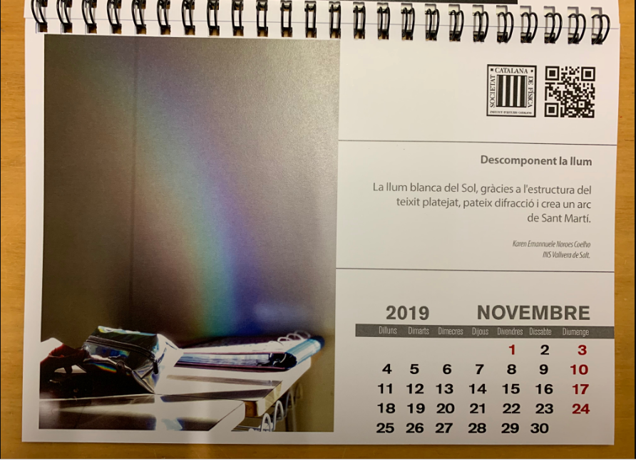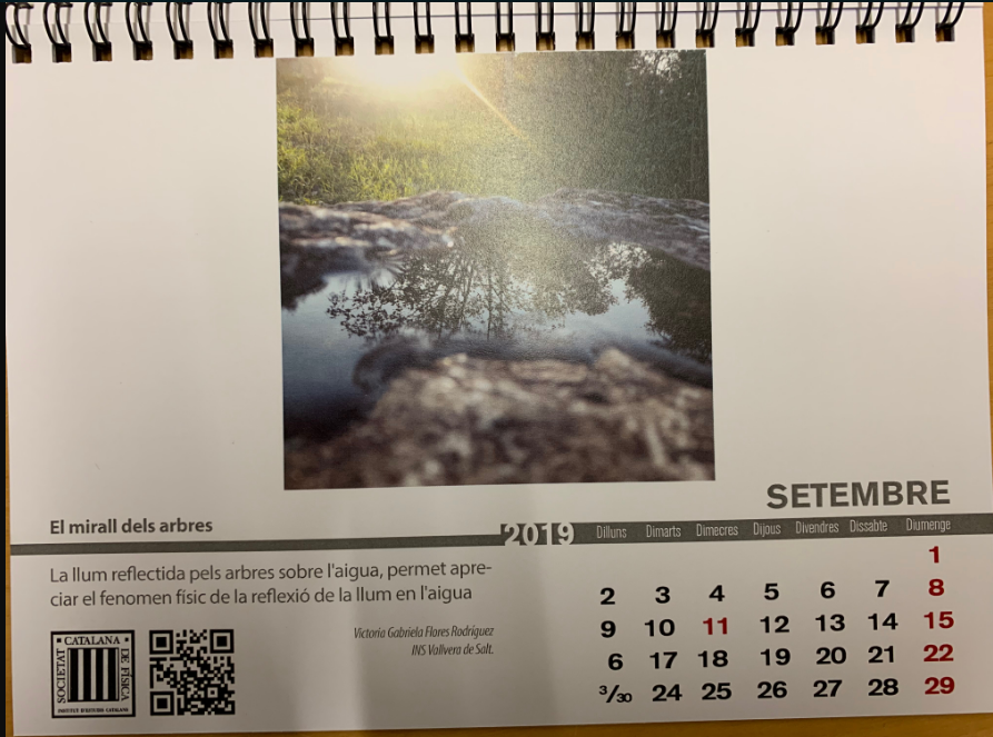 Aquest curs 2018-2019 dues alumnes del Vallvera de 1BAT de física van ser premiades en el concurs de fotografia de la Societat Catalana de Física. Les seves fotos van ser escollides com a mes de setembre i novembre del calendari que edita aquesta societat. Va ser molt divertit que tots els alumnes fessin fotos demostrant alguns principis de la física i que a més fossin artístiques, vam escollir les 4 millors i les vam presentar al concurs. Estem molt orgulloses de les guanyadores, la Victòria Flores i la Karen Noroes. Felicitats!!