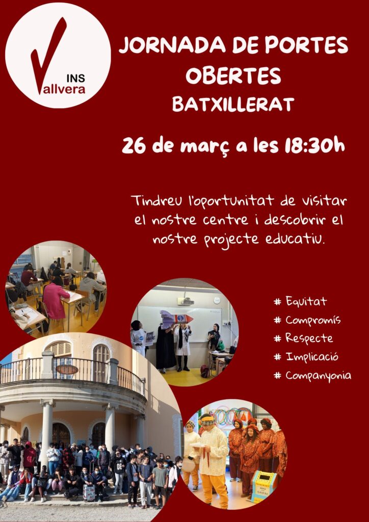 Jornada de portes obertes de Batxillerat: 26 de març a les 18.30h admin30/01/26 L’institut Vallvera celebrarà, el proper 26 de març, la jornada de portes obertes d’enguany per a Batxillerat. L’horari serà a les 18.30h i els assistents tindran l’oportunitat de visitar el centre i descobrir el nostre projecte educatiu.
