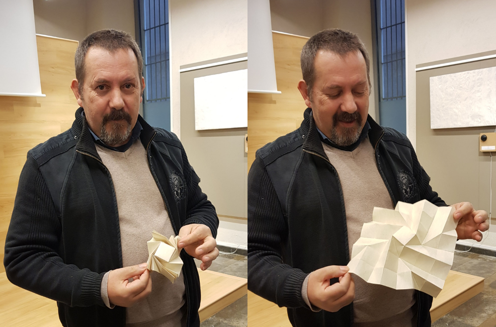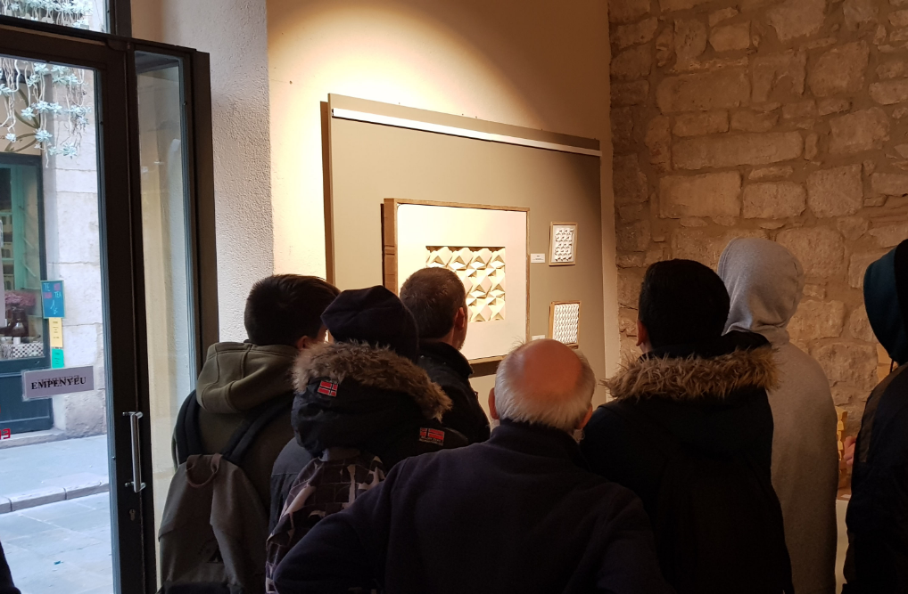 L’alumnat i professorat de les matèries de Tecnologia Industrial i Dibuix Tècnic de Batxillerat, vàrem realitzar el dimecres 20 de novembre, una visita guiada a l’exposició que aquests dies es pot visitar a la sala d’exposicions de la seu de l’associació d’Amics del Museu d’Art de Girona: “TESSEL·LATS DE PAPER I LLUM: del geomètric a l’orgànic”, del col·lectiu Vidal Font paper. Ens feu la visita guiada i demostració dels tessel·lats realitzats amb la tècnica de l’origami, el membre del col·lectiu en Joan Esparraguera, que ens donà una gran lliçó de superació personal i de com la geometria, unida a l’habilitat manual, ens permet realitzar obres artístiques únicament plegant paper, tal com s’ha fet des d’antic amb la Papiroflèxia a Europa i l’Origami al Japó.