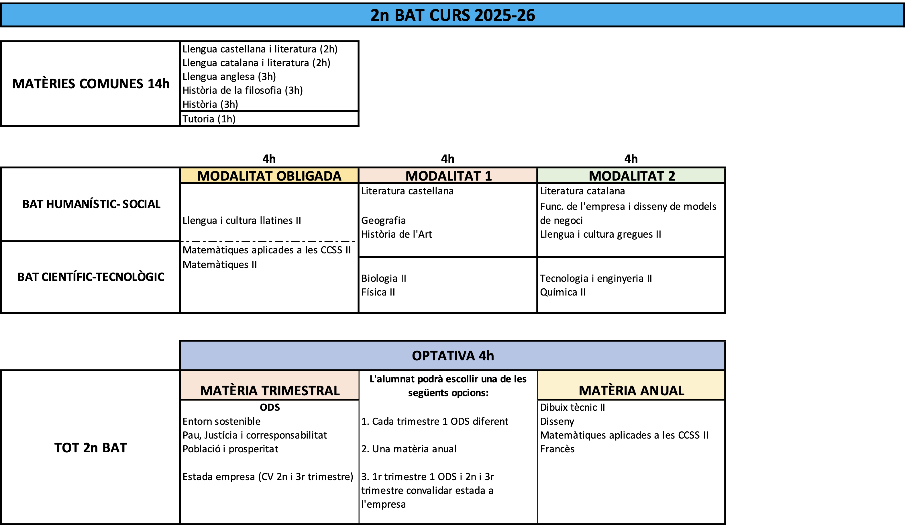 Les matèries comunes d’opció s’han de cursar obligatòriament en funció de la modalitat triada per l’alumne; les matèries especifiques completen el currículum personal de cada alumne i són a raó de 70 hores.