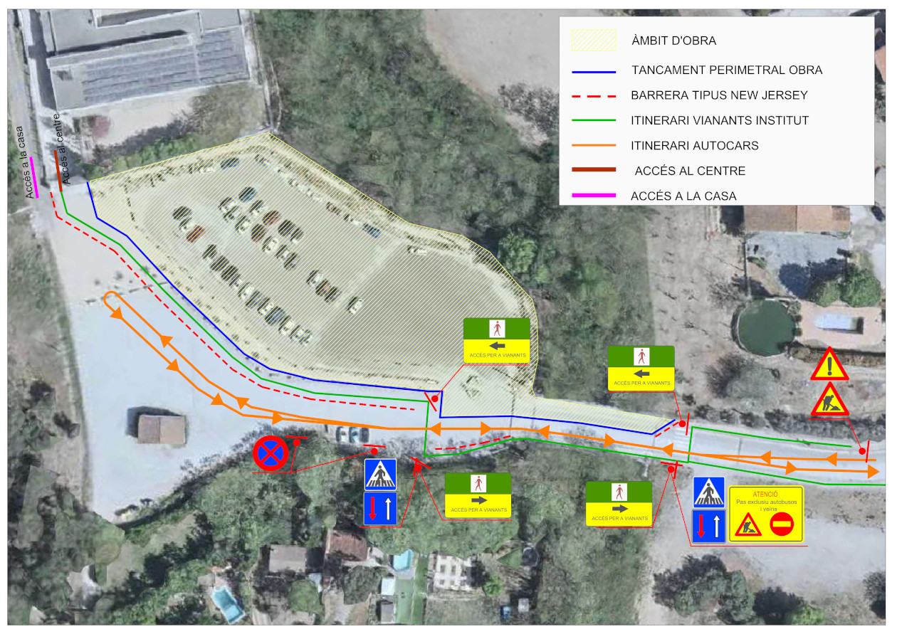 El proper dimarts dia 7 d’octubre esta previst l’inici de les obres a l’aparcament de l’Institut. En el plànol podeu veure les indicacions per a la circulació de vianants per la zona. Si accediu al centre amb cotxe pareu atenció a les orientacions de la guàrdia municipal.