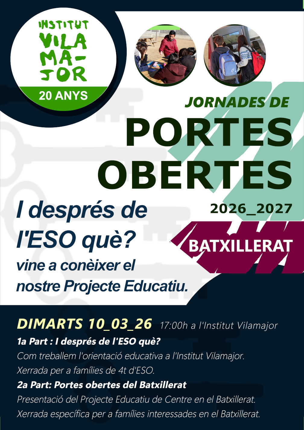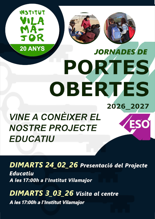 Dimarts 10 de març a les 17h, convoquem a les famílies de 4t d’ESO a una xerrada informativa amb el següent ordre del dia: I després de l’ESO què? Aquesta part de la reunió està destinada a totes les famílies de 4t d’ESO. Com treballem l’orientació a l’Institut Vilamajor? Quines possibilitats ofereix el sistema educatiu català? […]