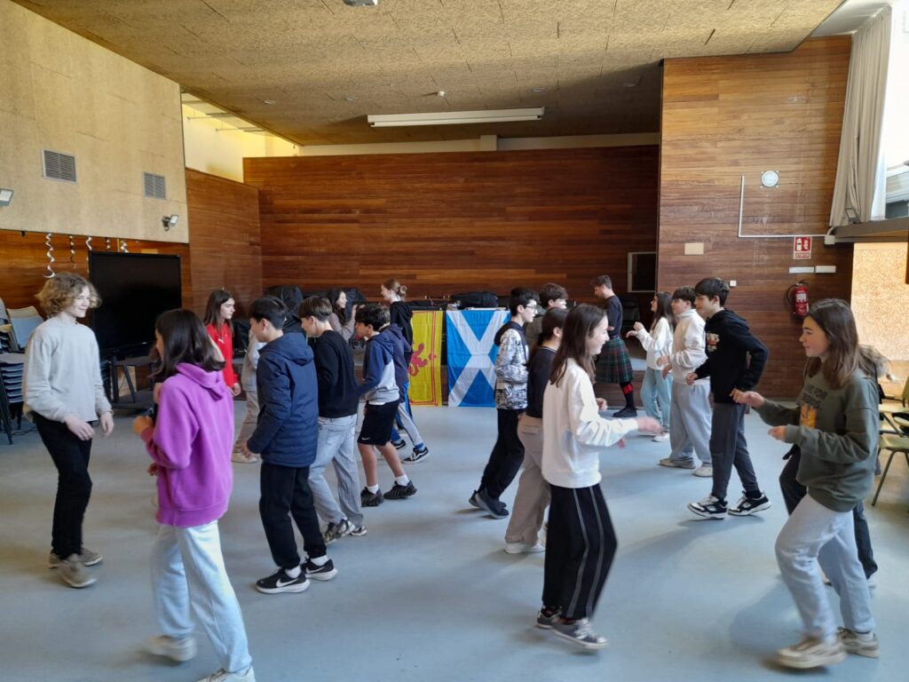 Aquest taller de dansa escocesa (céilidh) combina cultura, llengua estrangera i expressió cultural. Les explicacions són en anglès i els alumnes poden aprendre molt de la cultura d’Escòcia. Poden veure, per exemple, com és la seva bandera i la típica faldilla escocesa (kilt) que portava el professor.