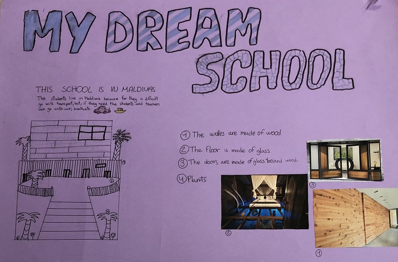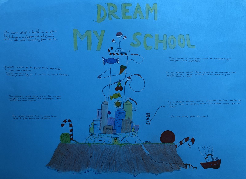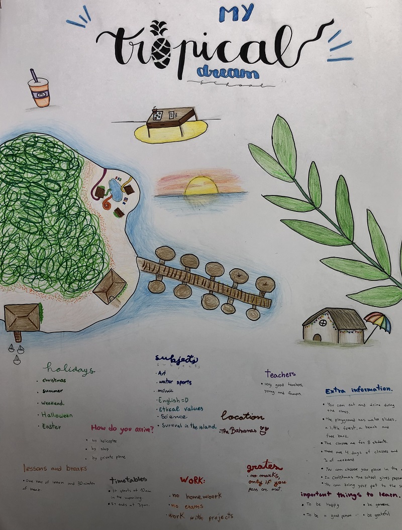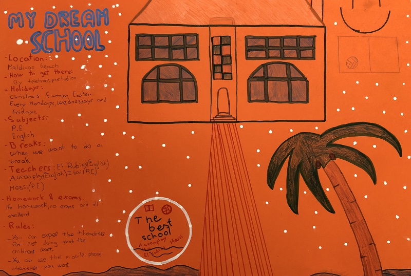 L’alumnat de l’Institut Vilatzara realitza la matèria de Cultura i Valors Ètics en llengua anglesa des de 1r d’ESO i fins a 4t. En aquesta línia de treball, alumnes de 1r d’ESO han imaginat contextos d’aprenentatge ideals a través de l’activitat “My dream school”. Els han creat amb format de mural, amb tècniques de “lettering”, i fent ús de la llengua anglesa com a llengua vehicular de la matèria.