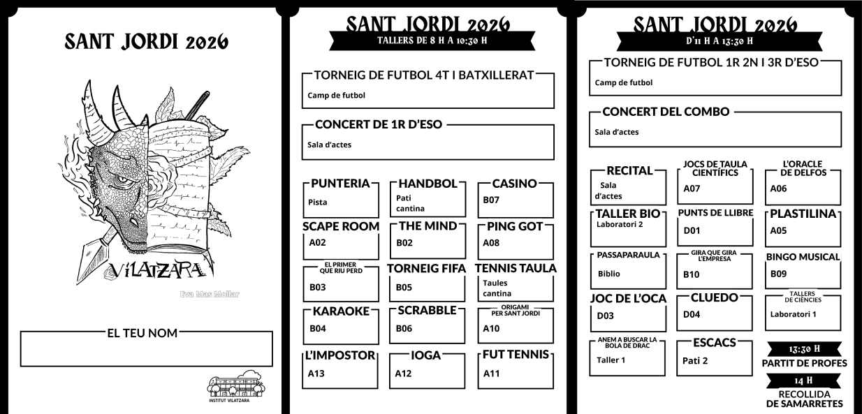Us compartim el programa on es concreten els horaris i espais on es realitzaran les diferents propostes com un recital literari, el concert de Sant Jordi, activitats esportives amb locució en directe i més de vint tallers organitzats pels diferents grups classe com un karaoke, el casino, l’scrabble, un scape room, torneig de tennis taula, sessions de ioga, jocs de taula científics, punts de llibre, escacs, entre d’altres.