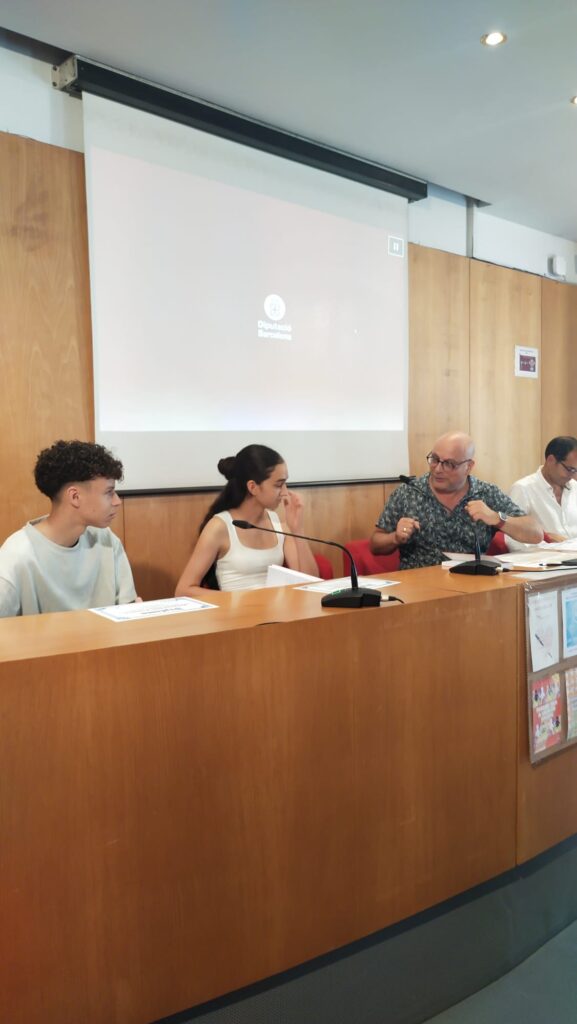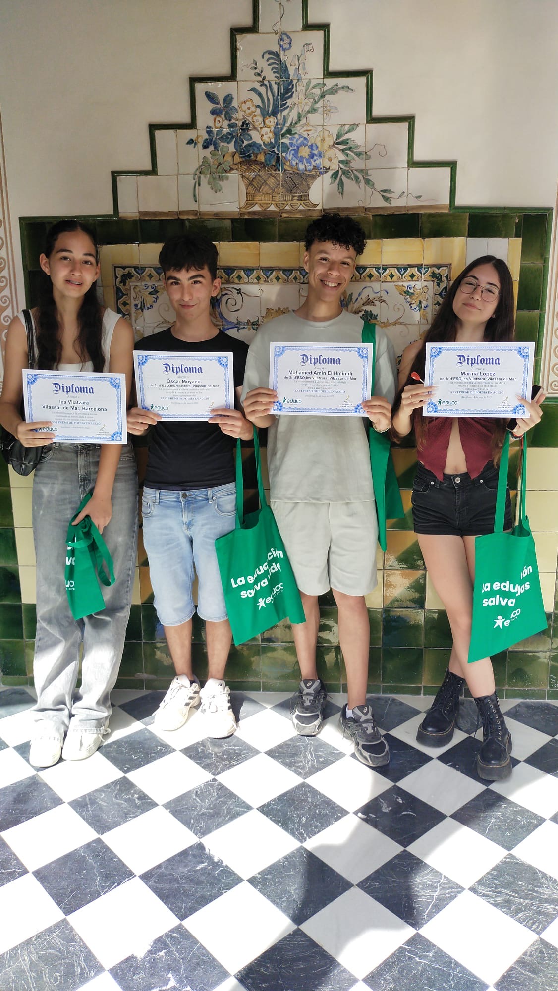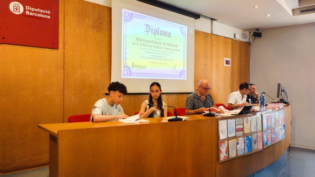 L’Amin El Hmimdi, l’Oscar Moyano, la Marina López i la Mia Heras van anar acompanyats de la seva professora de llengua castellana i literatura, Sara Avendaño, al CCCB (Centre de Cultura Contemporània de Barcelona) per llegir els seus poemes i recollir els diplomes i llibres que l’associació de Poesia en Acció els va atorgar com a premi per la seva participació en la XXVI edició de la Marató de poesia en valors.