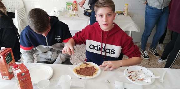 Chaque personne fait sa crêpe au fromage ou au Nutella. Et après nous mangeons les crêpes et nous buvons du jus de pommes.