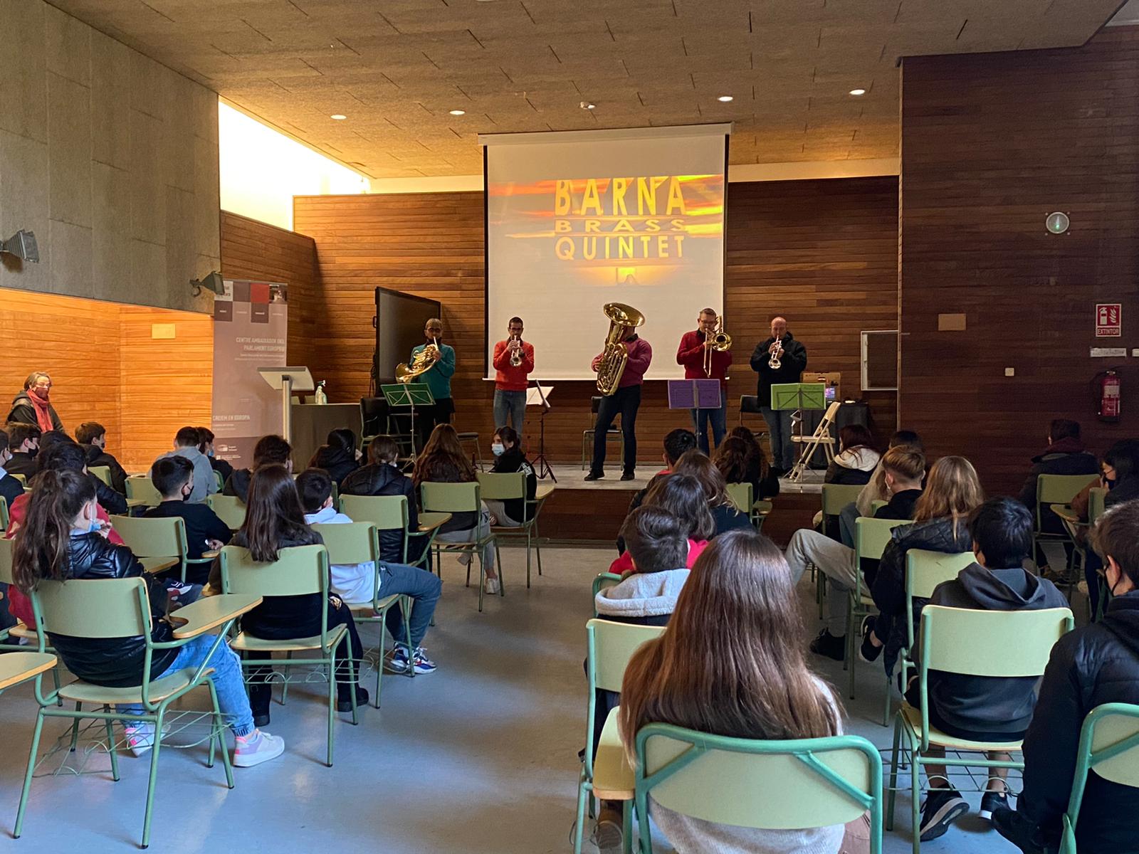 El passat dilluns 4 d’Abril la Barna Brass Quintet va oferir una audició sobre els Gèneres del cinema a l’alumnat de 2n d’ESO. En el concert es van interpretar en directe obres de grans compositors de bandes sonores com John Williams, Henry Mancini o Bernard Herrmann a la sala d’actes del Vilatzara. Les explicacions d’en Toni Chelvi van ajudar a reforçar i complementar els continguts treballats a classe sobre la música en el cinema.