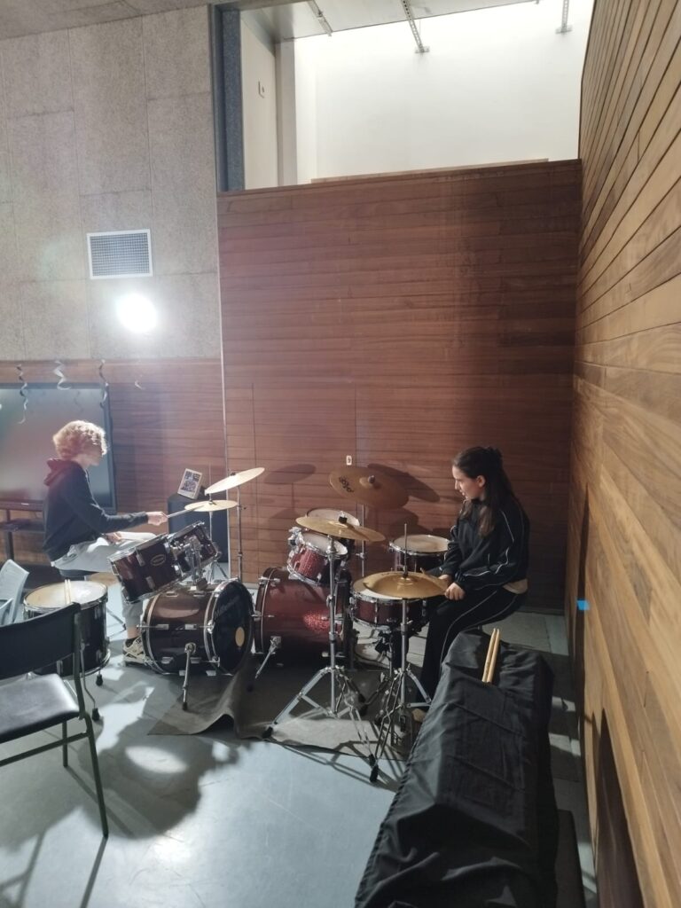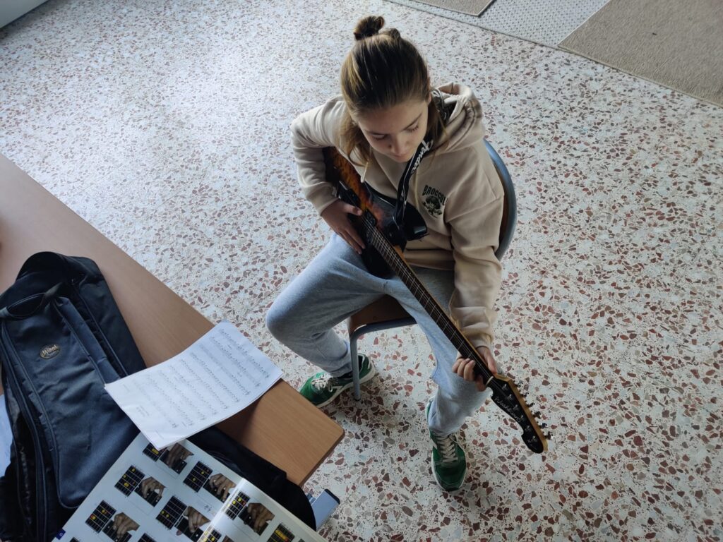 Per la seva banda, el professor de Socials Andreu Simon és l’encarregat d’ensenyar a tocar la bateria durant els patis de dimecres i dijous. I, per acabar, el professor de Tecnologia Jaume Linares desplega la seva tècnica per descobrir els secrets de la guitarra.