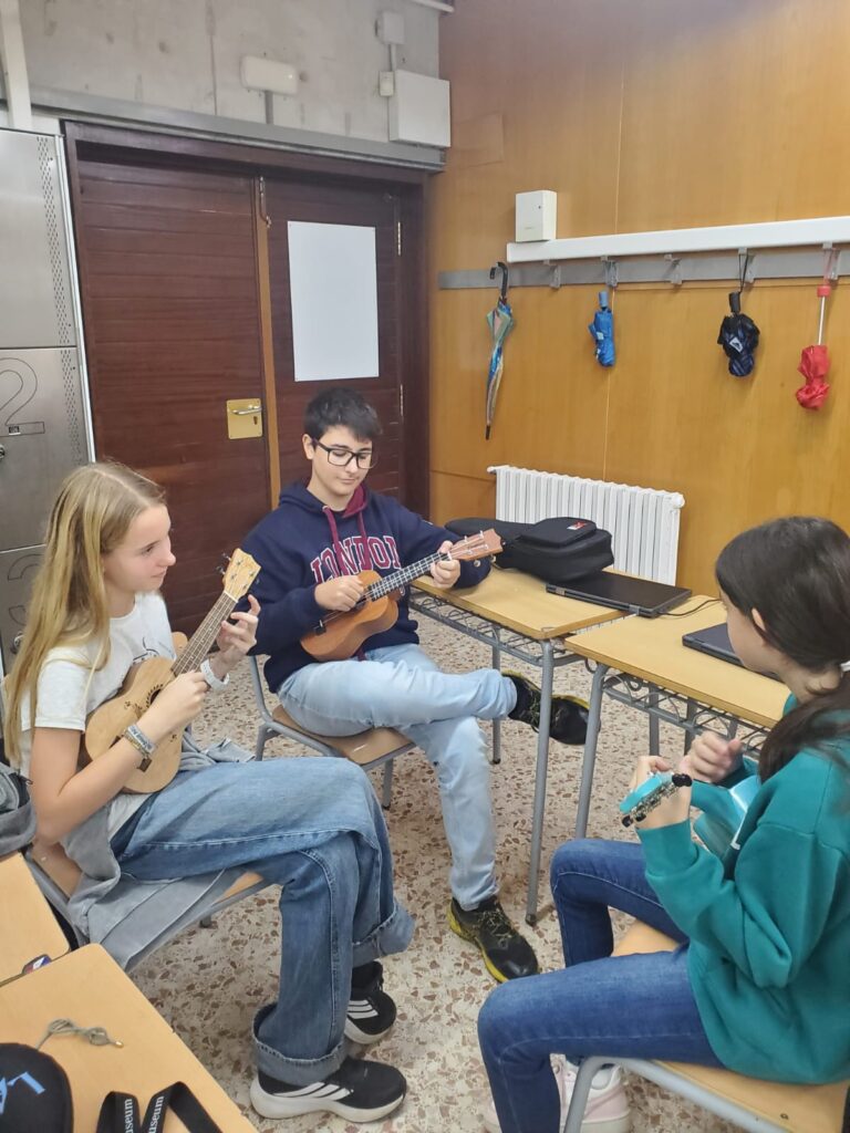 Aquest curs escolar continuem amb una iniciativa centrada a fomentar les aptituds musicals de l’alumnat. Així, dilluns a l’hora del pati (10.00 h), la professora de català Lina Mujal es converteix en professora d’ukelele i rep la visita d’un grupet d’alumnes interessats en aquest instrument.