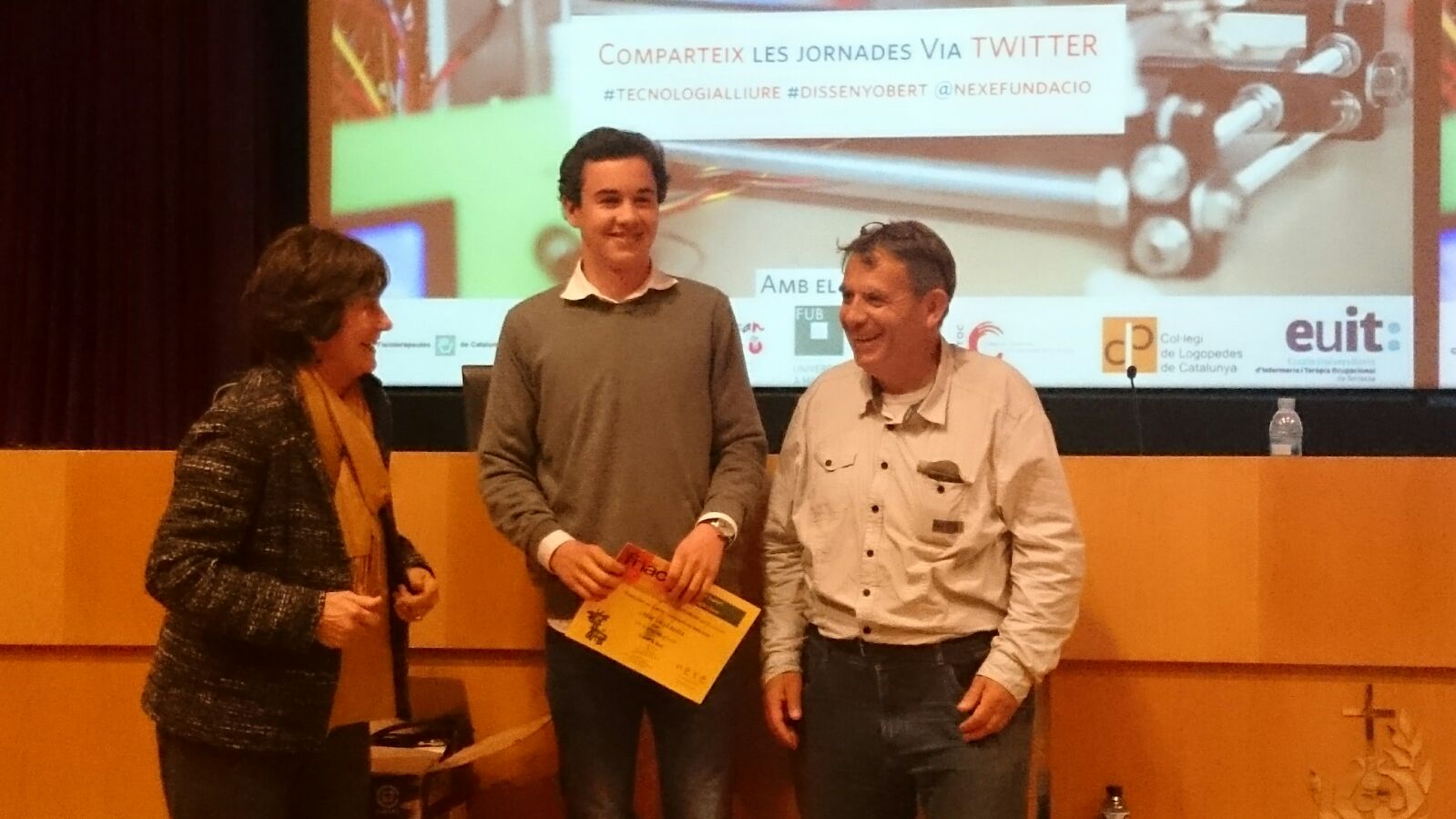 L’alumne Pere Valls, de 2n de batxillerat, amb el seu projecte “Crawl & Roll”: disseny i la construcció d’un aparell que funciona com a cadira bascular i alhora com a “gatejador”, va guanyar el primer premi.