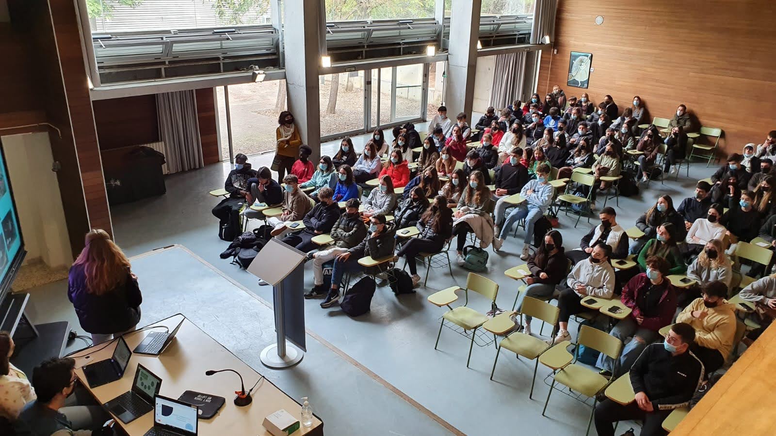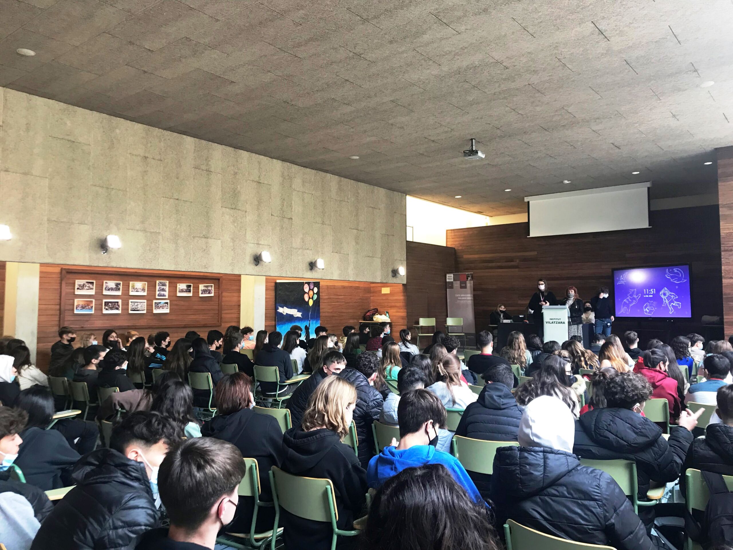 L’alumnat seleccionat s’ha aplegat a la Sala d’Actes per mostrar les exposicions dels seus treballs a estudiants que actualment cursen 1r de Batxillerat. Tot seguit s’ha iniciat un col·loqui, moderat per les professores Natàlia Aliaga i Raquel Úbeda, per tal de resoldre dubtes i inquietuds de l’alumnat que ha de fer el TR.