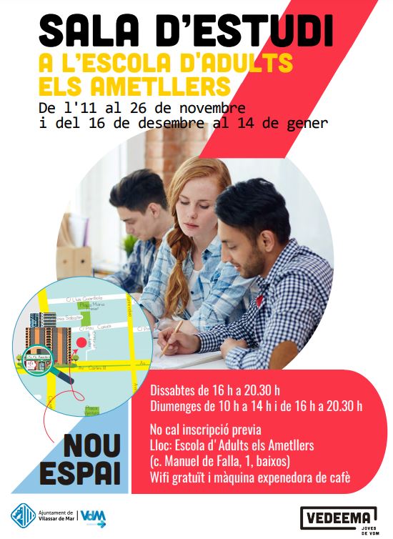El dissabte 11 de novembre s’obrirà una sala d’estudi els caps de setmana per tal que l’alumnat de l’ESO i Batxillerat que tingui més de 14 anys utilitzi l’espai per estudiar o fer deures els caps de setmana.