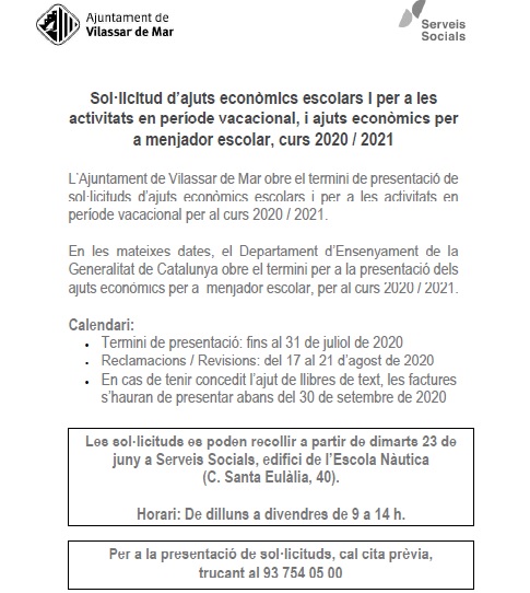 L’Ajuntament de Vilassar de Mar obre el termini de presentació de sol·licituds d’ajuts econòmics escolars i per a les activitats en període vacacional per al curs 2020 / 2021.